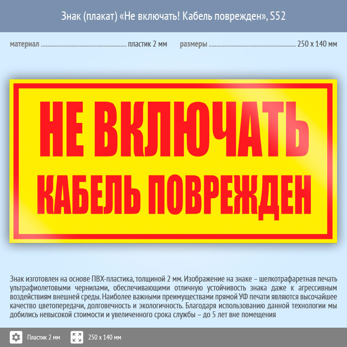 Знак (плакат) «Не включать! Кабель поврежден», S52 (пластик, 250х140 мм) в Твери купить