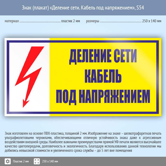Знак (плакат) «Деление сети. Кабель под напряжением», S54 (пластик, 250х140 мм) в Твери купить