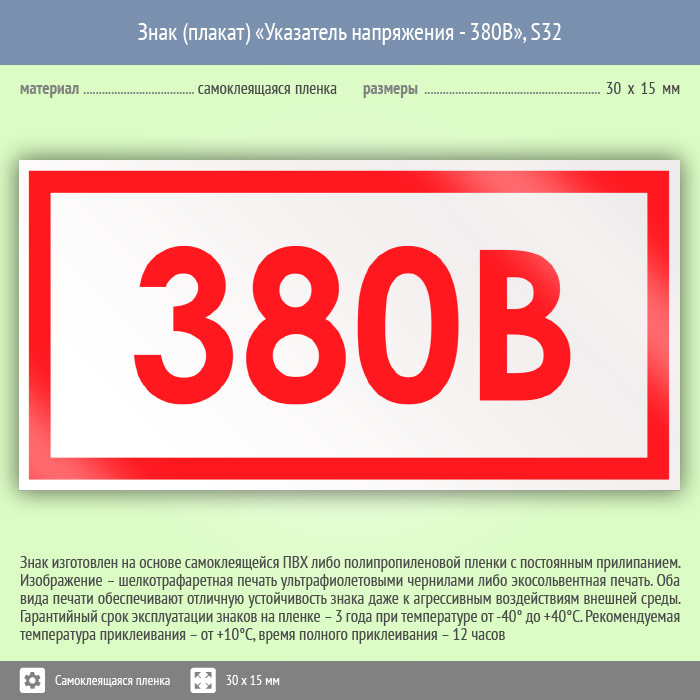 Знак (плакат) «Указатель напряжения - 380В», S32 (50 штук, пленка, 30х15 мм) в Твери купить