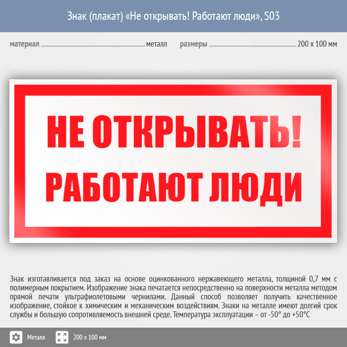 Знак (плакат) «Не открывать! Работают люди», S03 (металл, 200х100 мм) в Твери купить