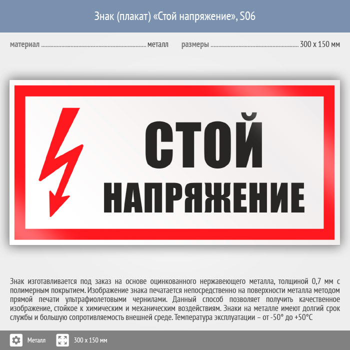 Знак (плакат) «Стой напряжение», S06 (металл, 300х150 мм) в Твери купить