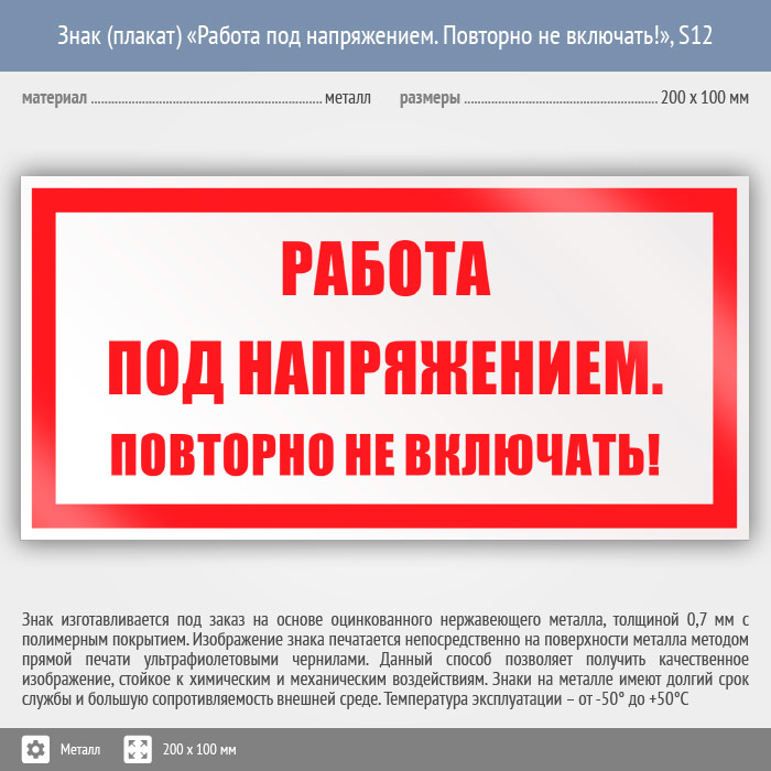 Знак (плакат) «Работа под напряжением. Повторно не включать!», S12 (металл, 200х100 мм) в Твери купить