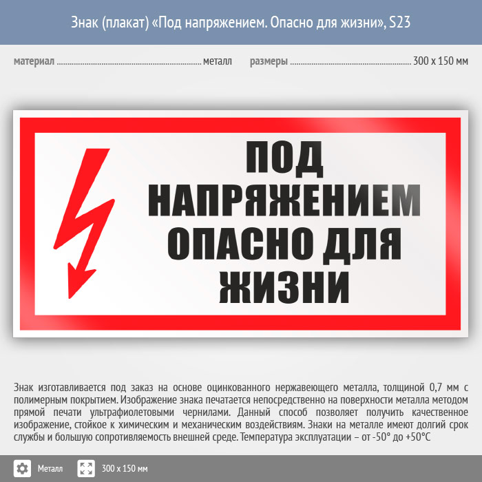Знак (плакат) «Под напряжением. Опасно для жизни», S23 (металл, 300х150 мм) в Твери купить