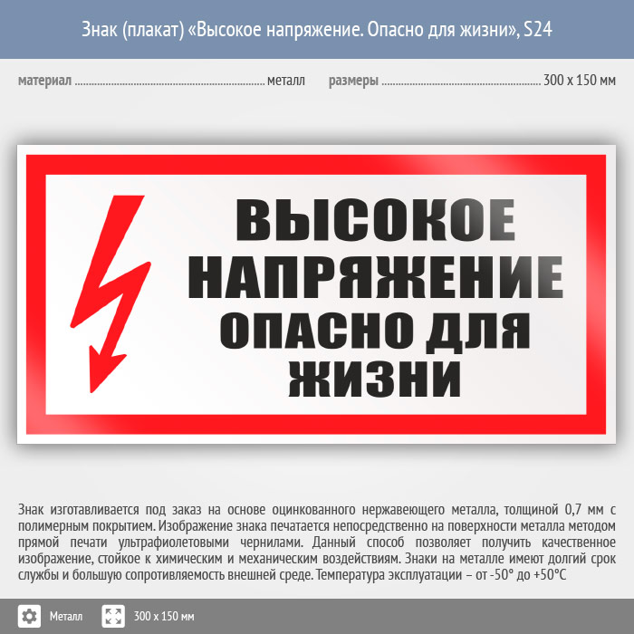 Знак (плакат) «Высокое напряжение. Опасно для жизни», S24 (металл, 300х150 мм) в Твери купить