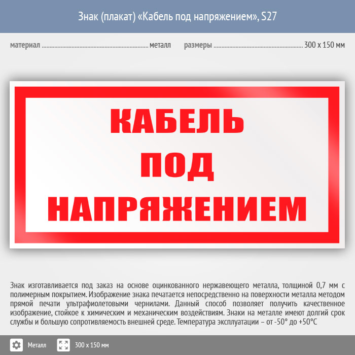 Знак (плакат) «Кабель под напряжением», S27 (металл, 300х150 мм) в Твери купить