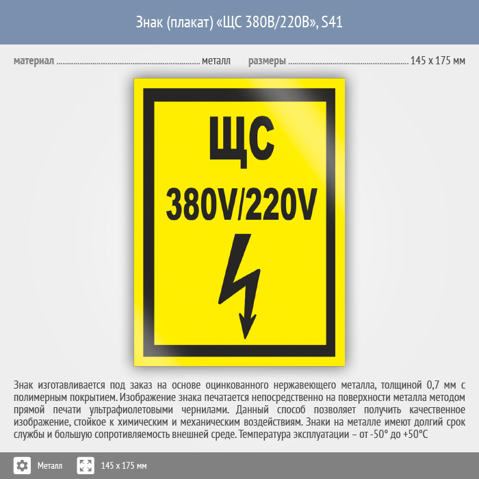Знак (плакат) «ЩС 380В/220В», S41 (металл, 145х175 мм) в Твери купить