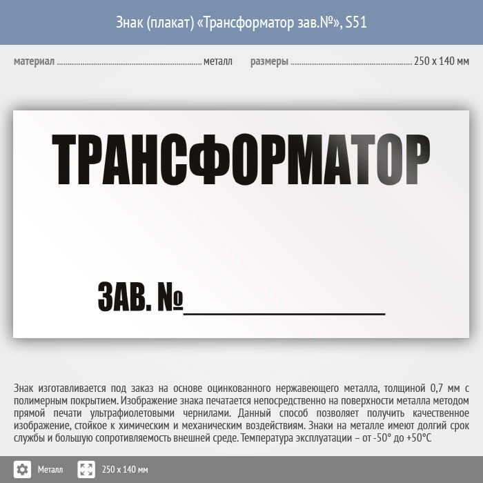 Знак (плакат) «Трансформатор зав.№», S51 (металл, 250х140 мм) в Твери купить