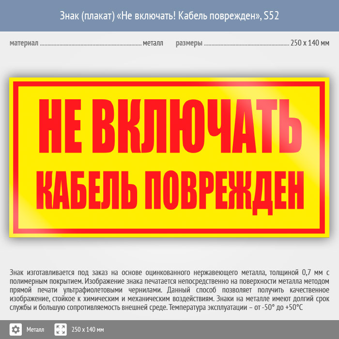 Знак (плакат) «Не включать! Кабель поврежден», S52 (металл, 250х140 мм) в Твери купить