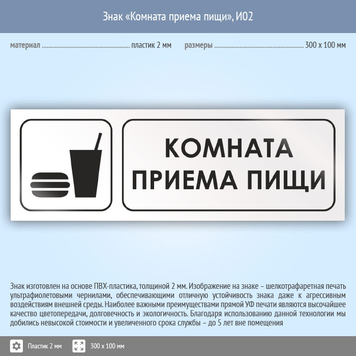 Знак «Комната приема пищи», И02 (пластик, 300х100 мм) в Твери купить