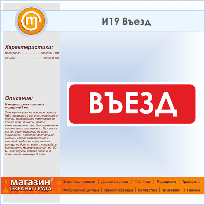 Знак «Въезд», И19 (пластик, 600х200 мм) в Твери купить