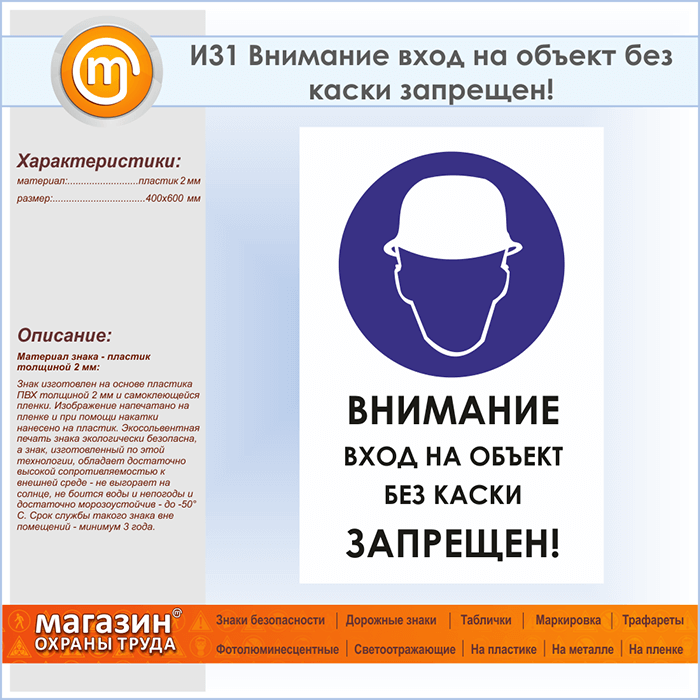 Знак «Внимание вход на объект без каски запрещен!», И31 (пластик, 400х600 мм) в Твери купить