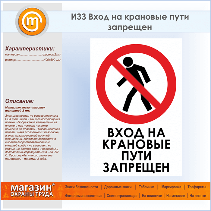 Знак «Вход на крановые пути запрещен», И33 (пластик, 400х600 мм) в Твери купить