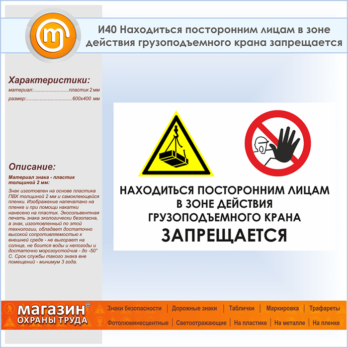 Знак «Находиться посторонним лицам в зоне действия грузоподъемного крана запрещается», И40 (пластик, 600х400 мм) в Твери купить