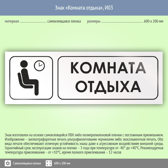Знак «Комната отдыха», И03 (пленка, 600х200 мм) в Твери купить