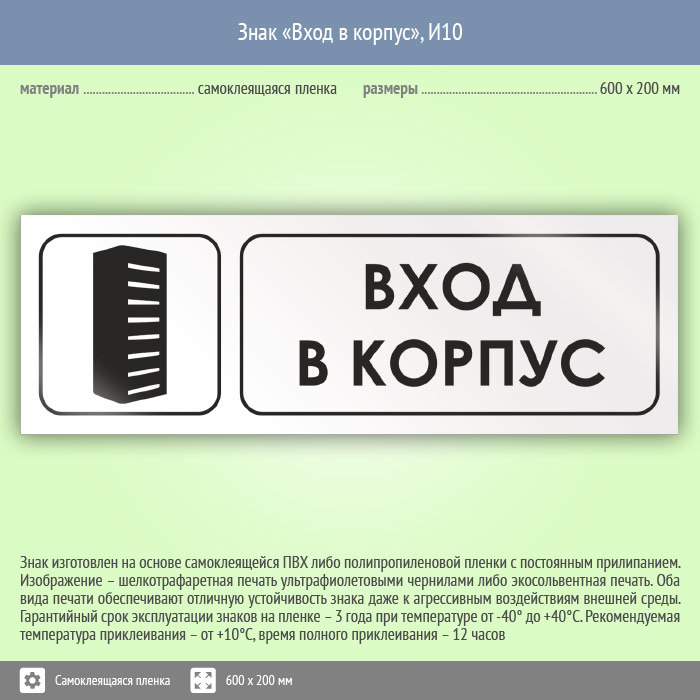 Знак «Вход в корпус», И10 (пленка, 600х200 мм) в Твери купить