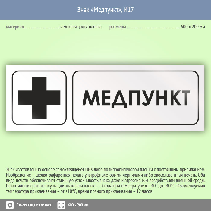 Знак «Медпункт», И17 (пленка, 600х200 мм) в Твери купить
