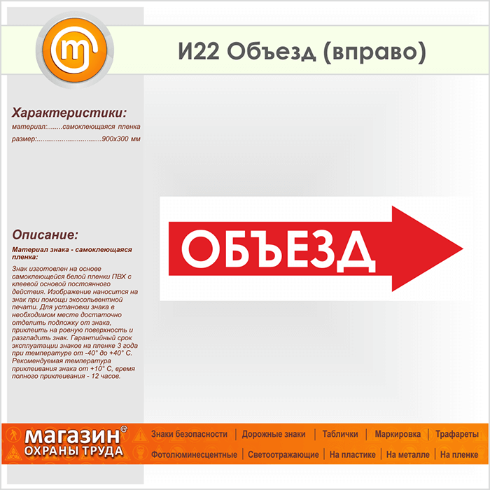 Знак «Объезд (вправо)», И22 (пленка, 900х300 мм) в Твери купить