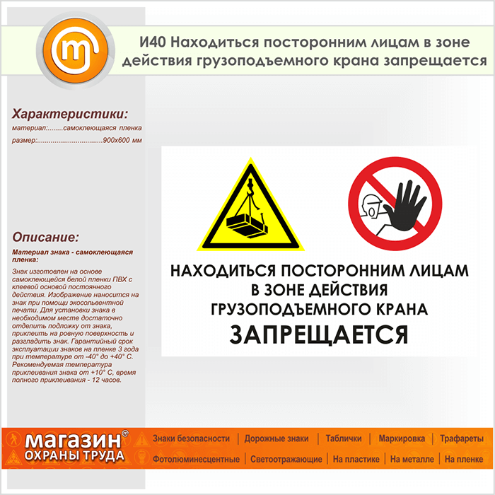 Знак «Находиться посторонним лицам в зоне действия грузоподъемного крана запрещается», И40 (пленка, 900х600 мм) в Твери купить