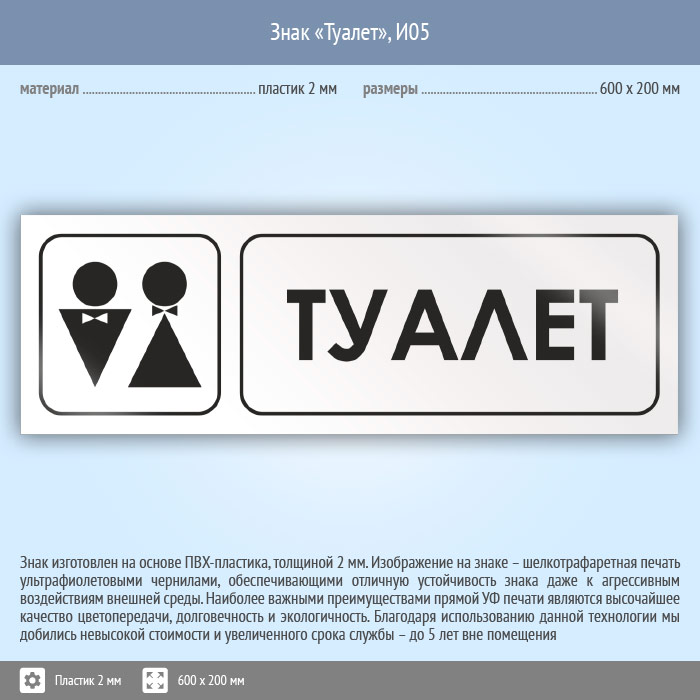 Знак «Туалет», И05 (пластик, 600х200 мм) в Твери купить