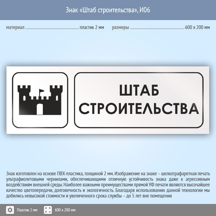 Знак «Штаб строительства», И06 (пластик, 600х200 мм) в Твери купить