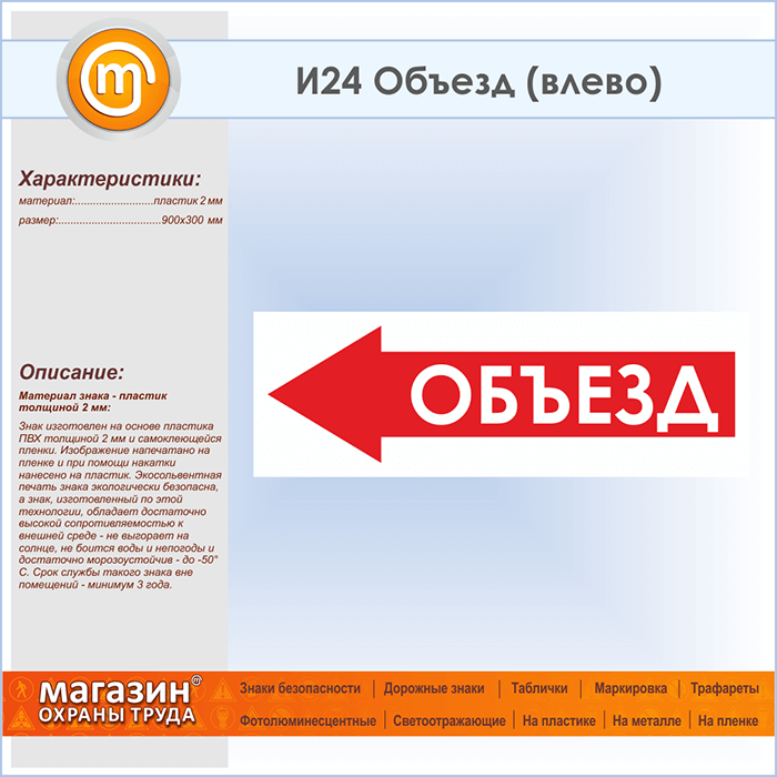 Знак «Объезд (влево)», И24 (пластик, 900х300 мм) в Твери купить