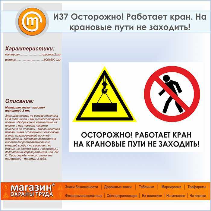 Знак «Осторожно! Работает кран. На крановые пути не заходить!», И37 (пластик, 900х600 мм) в Твери купить