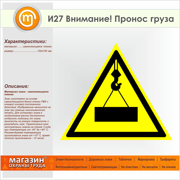 Знак «Внимание! Пронос груза», И27 (пленка, сторона 700 мм) в Твери купить