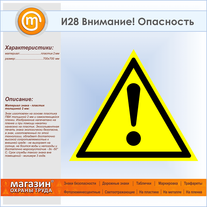 Знак «Внимание! Опасность», И28 (пластик, сторона 700 мм) в Твери купить