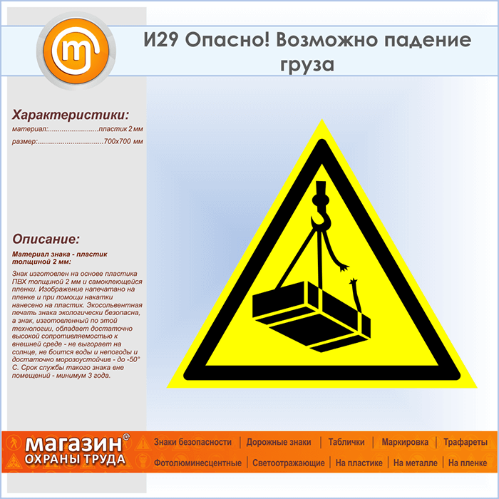 Знак «Опасно! Возможно падение груза», И29 (пластик, сторона 700 мм) в Твери купить