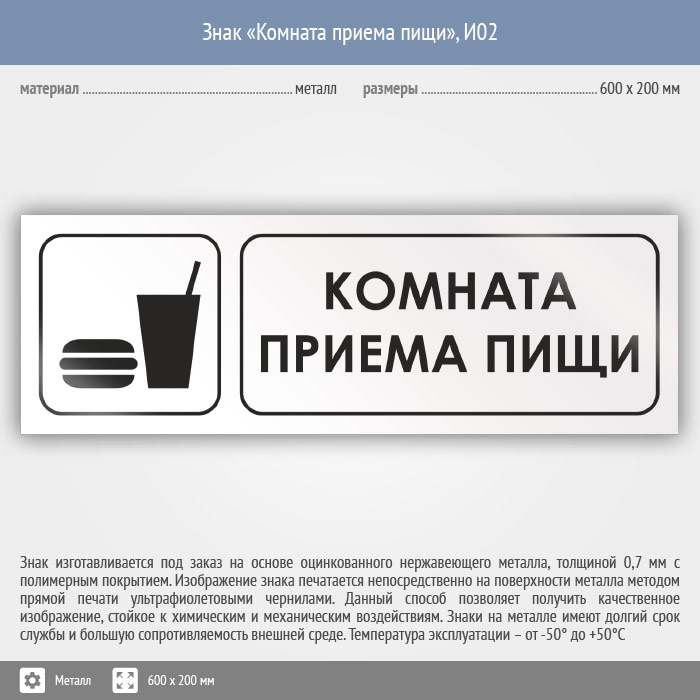 Знак «Комната приема пищи», И02 (металл, 600х200 мм) в Твери купить