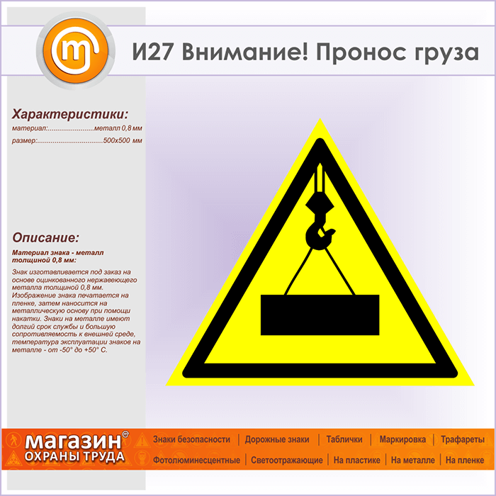 Знак «Внимание! Пронос груза», И27 (металл, сторона 500 мм) в Твери купить