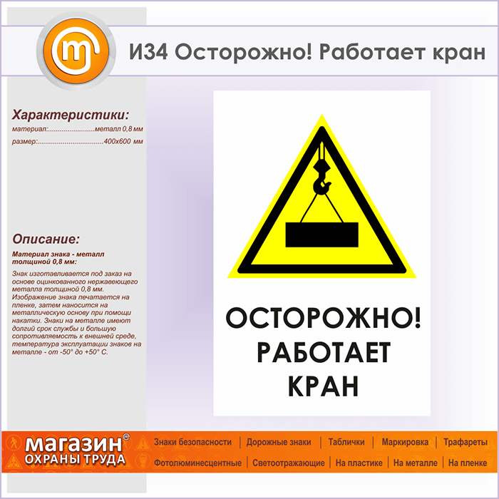 Знак «Осторожно! Работает кран», И34 (металл, 400х600 мм) в Твери купить