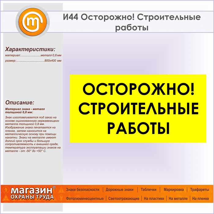 Знак «Осторожно! Строительные работы», И44 (металл, 800х400 мм) в Твери купить