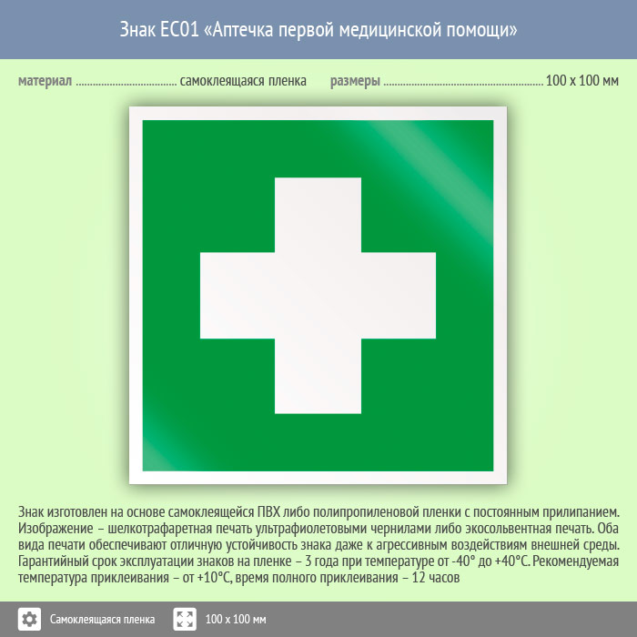 Знак EC01 «Аптечка первой медицинской помощи» (пленка, 100х100 мм) в Твери купить