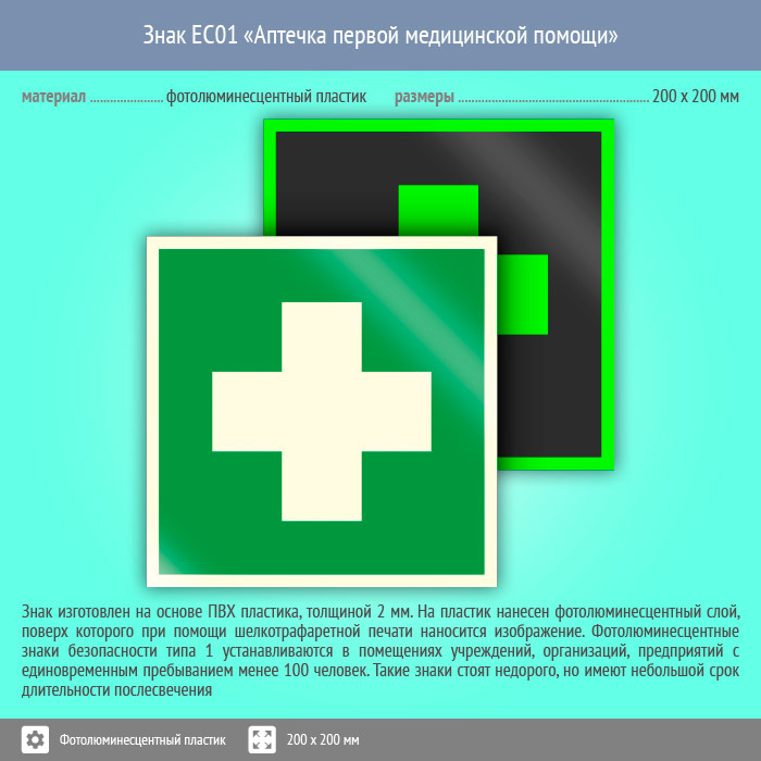 Знак EC01 «Аптечка первой медицинской помощи» (фотолюминесцентный пластик, 200х200 мм) в Твери купить