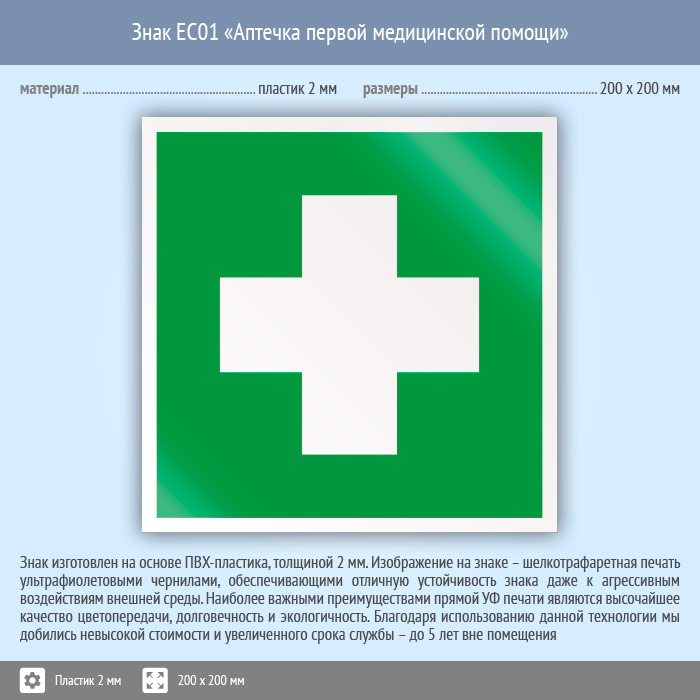 Знак EC01 «Аптечка первой медицинской помощи» (пластик, 200х200 мм) в Твери купить