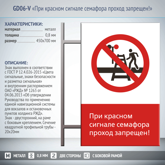 Знак «При красном сигнале семафора проход запрещен!», GD06-V (двусторонний вертикальный, 450х700 мм, металл, на раме с боковым креплением) в Твери купить