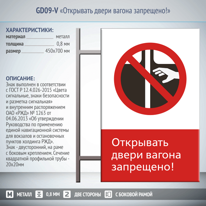 Знак «Открывать двери вагона запрещено!», GD09-V (двусторонний вертикальный, 450х700 мм, металл, на раме с боковым креплением) в Твери купить