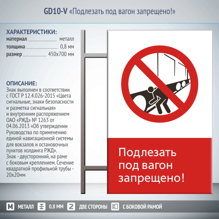 Знак «Подлезать под вагон запрещено!», GD10-V (двусторонний вертикальный, 450х700 мм, металл, на раме с боковым креплением) в Твери купить