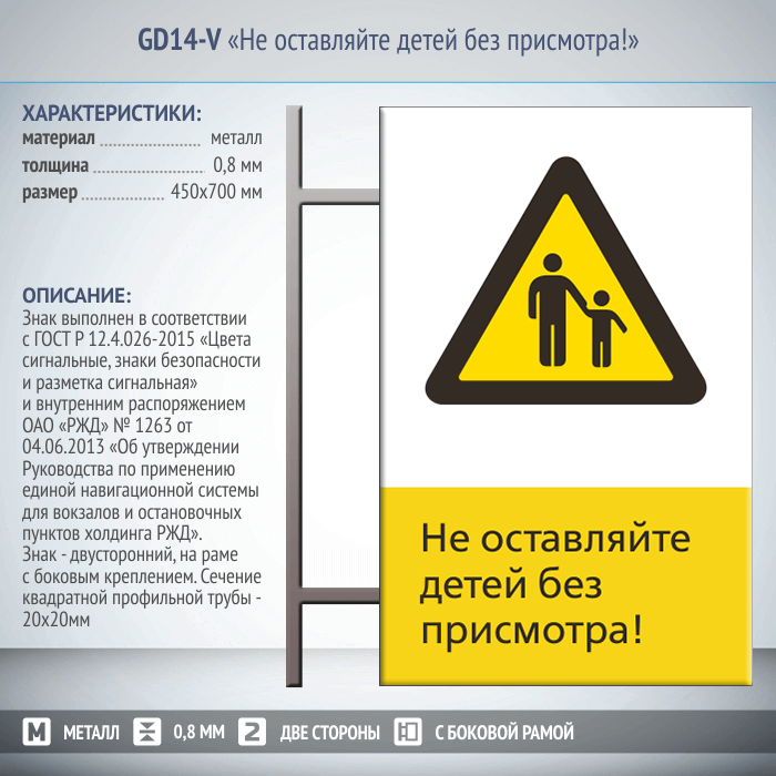 Знак «Не оставляйте детей без присмотра!», GD14-V (двусторонний вертикальный, 450х700 мм, металл, на раме с боковым креплением) в Твери купить