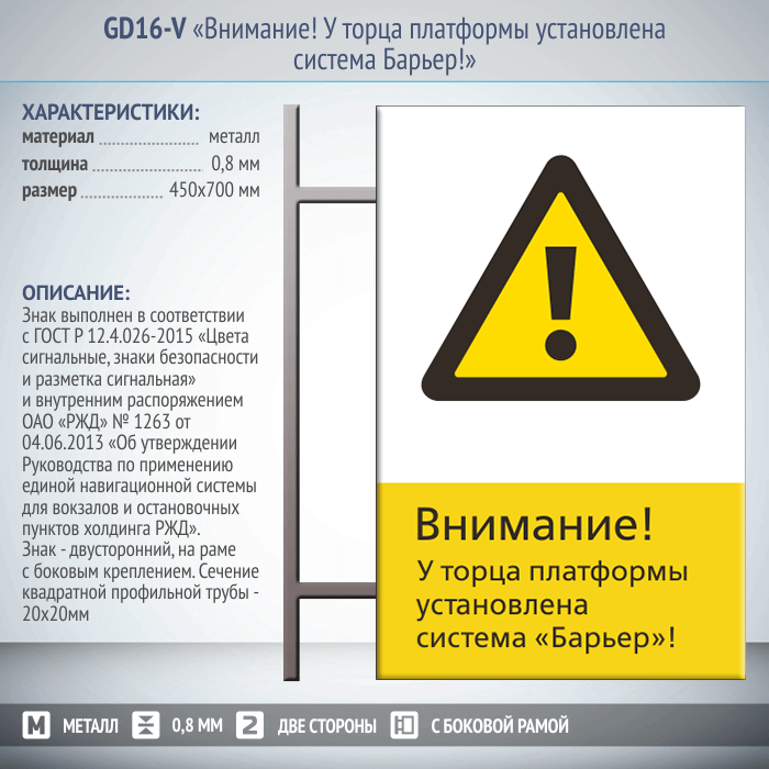 Знак «Внимание! У торца платформы установлена система Барьер!», GD16-V (двусторонний вертикальный, 450х700 мм, металл, на раме с боковым креплением) в Твери купить