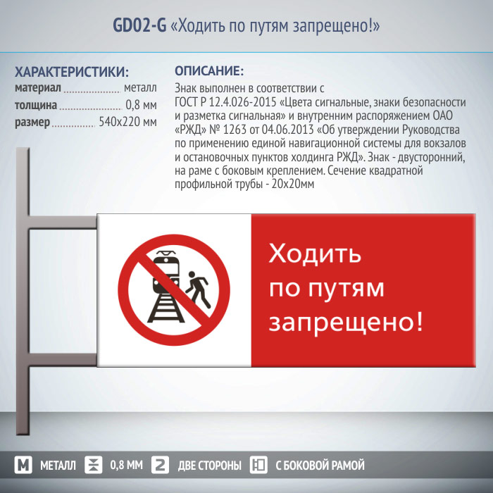 Знак «Ходить по путям запрещено!», GD02-G (двусторонний горизонтальный, 540х220 мм, металл, на раме с боковым креплением) в Твери купить