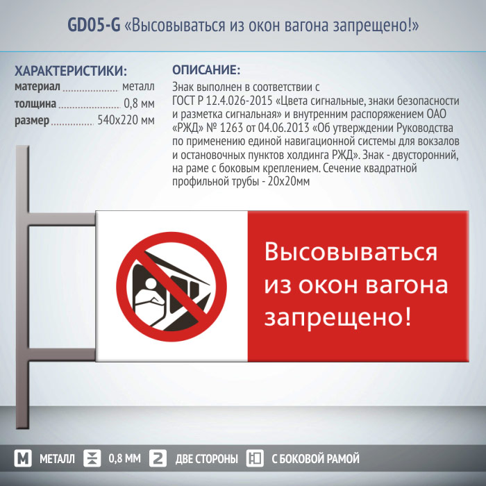 Знак «Высовываться из окон вагона запрещено!», GD05-G (двусторонний горизонтальный, 540х220 мм, металл, на раме с боковым креплением) в Твери купить
