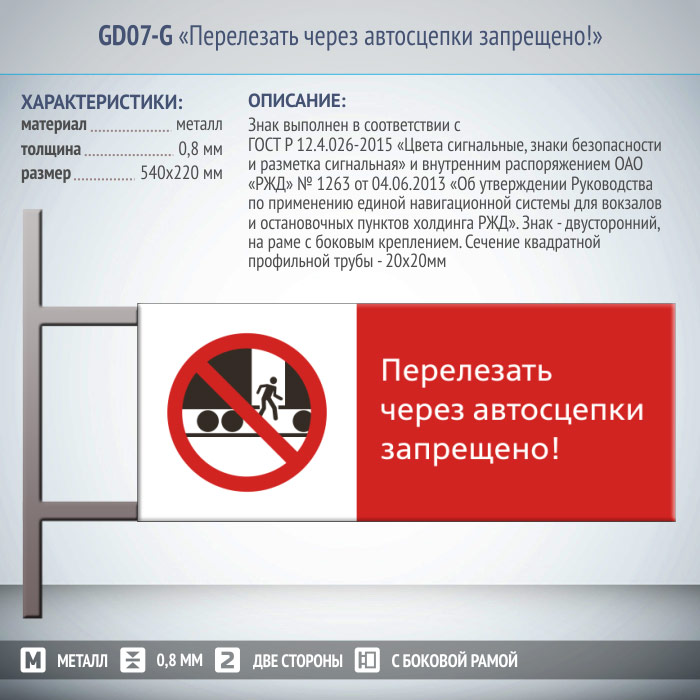 Знак «Перелезать через автосцепки запрещено!», GD07-G (двусторонний горизонтальный, 540х220 мм, металл, на раме с боковым креплением) в Твери купить