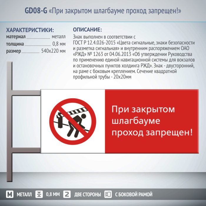 Знак «При закрытом шлагбауме проход запрещен!», GD08-G (двусторонний горизонтальный, 540х220 мм, металл, на раме с боковым креплением) в Твери купить