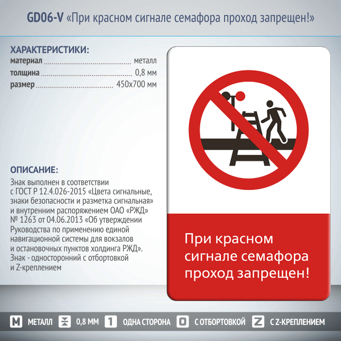Знак «При красном сигнале семафора проход запрещен!», GD06-V (односторонний вертикальный, 450х700 мм, металл, с отбортовкой и Z-креплением) в Твери купить