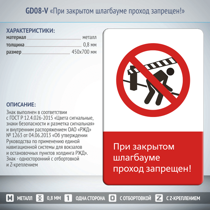 Знак «При закрытом шлагбауме проход запрещен!», GD08-V (односторонний вертикальный, 450х700 мм, металл, с отбортовкой и Z-креплением) в Твери купить