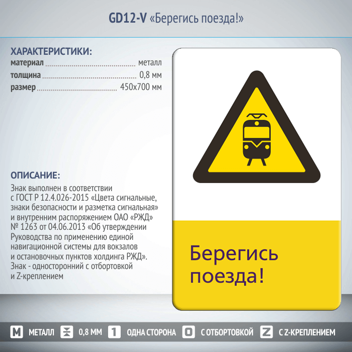 Знак «Берегись поезда!», GD12-V (односторонний вертикальный, 450х700 мм, металл, с отбортовкой и Z-креплением) в Твери купить