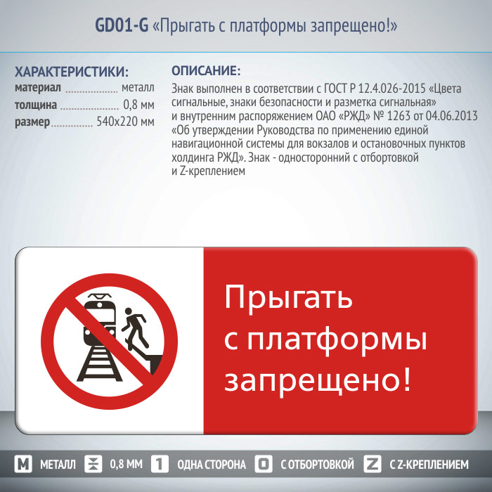 Знак «Прыгать с платформы запрещено!», GD01-G (односторонний горизонтальный, 540х220 мм, металл, с отбортовкой и Z-креплением) в Твери купить