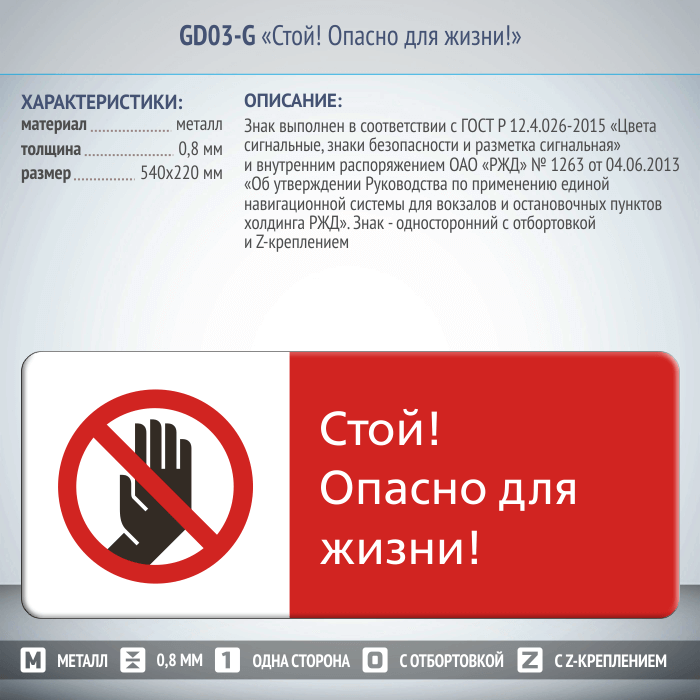 Знак «Стой! Опасно для жизни!», GD03-G (односторонний горизонтальный, 540х220 мм, металл, с отбортовкой и Z-креплением) в Твери купить